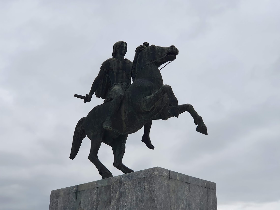 에게 해를 따라 연해 있는 테르마이코스만(灣)(Θερμαϊκός Κόλπος, Thermaic Gulf)에는 긴 해안길이 조성돼 있는데 그 중 화이트 타워가 있는 주변부터는 넓은 광장이 있다. 이곳에서 산책로를 따라가다 보면 약 6 미터 높이의 알렉산드로스 3세 대왕(Ἀλέξανδρος Γ' ο Μέγας, 영어 알렉산더 대왕(Alexander the Great)) 동상이 있다. 알렉산드로스 대왕은 마케도니아 왕국 아르게아스 왕조의 26대 왕으로 페르시아 전쟁에서 승리하고 헬레니즘 제국(알렉산드로스 대왕이 마케도니아와 그리스, 소아시아, 이집트, 아케메네스 왕조, 그리고 지금의 파키스탄 일부까지를 점령해서 건설한 제국으로 '알렉산드로스(알렐산더) 제국'이라고도 한다.)을 만든 왕이다. 그러나 그는 방대한 영토를 남기고 서른둘의 젊은 나이에 죽고 만다. 이후 제국은 네 개의 왕국으로 분리되어 부하들에 의해 통치되는데, 그의 누이와 결혼하고 테살로니키를 건설한 마케도니아의 왕 카산드로스가 그들 중 한 명이다. 그러니 이 도시에서 알렉산드로스 대왕의 기마상(Άγαλμα Μεγάλου Αλεξάνδρου, Alexander the Great Statue)을 볼 수 있는 것은 지극히 당연하고 자연스러운 일일 것이다.