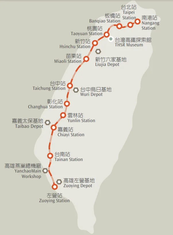 대만의 수도 타이베이(난강(南港/Nangang))에서 가오슝을 남북으로 길게 잇는 대만 고속철도는 현지에서 ‘고철(高鐵, Gāotiě(까오톄)로 읽음)’로 줄여 부른다. 난강역에서 종착역인 쭤잉역까지 약 2시간이 걸리고, 열차의 최고 속도는 300㎞/h로 우리 KTX와 비슷한 정도이다. 2007년 개통한 타이완 고속철도는 독일과 프랑스의 고속철도 선로 기술에 일본의 신칸센 차량을 도입했는데, 신칸센 최초의 해외 수출로 알려져 있다. 계약 체결 당시 대만은 독자 고속열차 제작에 관심이 없었기 때문에 차량 도입과 함께 운용 및 정비 관련 기술 정도만 이전 받았다고 한다.