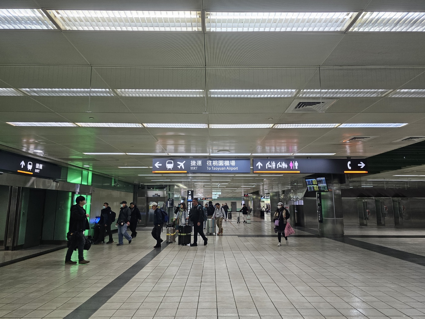 우리는 공항으로 가야 했기 때문에 10시 20분쯤 고속철도 타오위안(桃園, Taoyuan) 역에서 내렸다. 티켓을 출구에 넣고 앞에서 빼면 문이 열린다. 그렇게 고속철도 역에서 빠져나와 MRT, 공항 표지를 따라 엘리베이터나 에스컬레이터를 타고 2층으로 가면 MRT 개찰구가 나온다. 이지카드를 찍고 에스컬레이터를 타고 다시 한 층을 더 올라가면 열차 플랫폼이다.(공항 가는 사람들이 많고 입구가 좁아 많이 붐볐다.) 시간을 점검해 보니 고속철도 타오위안역에서 공항행 MRT로 환승해서 공항에 도착, 체크인 카운터까지는 총 약 40분 이상이 걸렸다. 충분히 여유 시간을 계산해서 출발해야 할 것으로 생각된다.