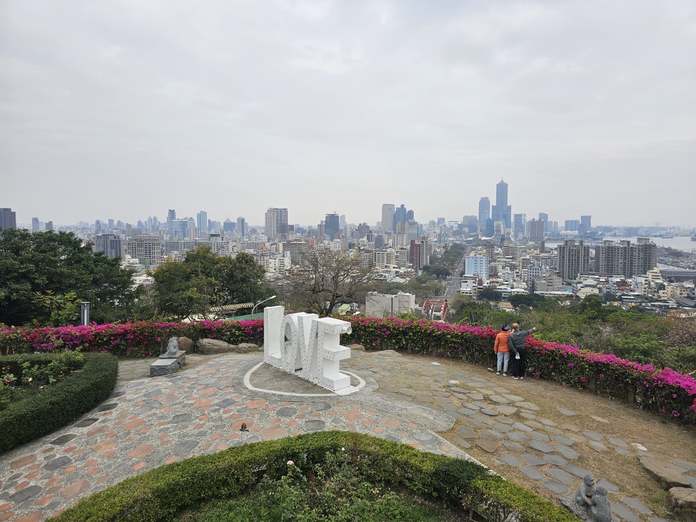 또 한쪽에는 전망대가 있는데 난간에 32 개의 언어로 쓰인 사랑의 선언문 장식판이 있다. 이것은 사랑이 국경의 구분이 없는 세계적인 공통 언어임을 상징하는 것이라 한다. 사실 여기에 각국의 문자가 쓰였는지는 정확히 몰랐는데 돌아와 사진을 보니 마침 한글도 있는 것을 발견했다. '난 널 사랑해'라는 한글이 보였는데 전망대 위 안쪽에서 제대로 읽을 수 있는 위치에 있었다. 이 전망대에 올라 보는 가오슝의 야경이 특히 화려하고 아름다워 사람들이 많이 찾는다 하는데, 우리가 간 시간은 낮이라 화려한 불빛은 없었지만 눈이 시원한 전망을 볼 수 있었다.
