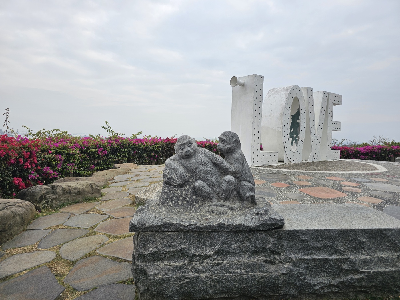 이곳에 다다르면 작은 광장 중앙에 흰색의 'LOVE' 글자 조형물이 먼저 눈에 띈다. 그 앞에는 세 개의 원숭이 석조가 있는데 각각 사랑에 빠졌을 때의 세 가지 각기 다른 단계를 상징한다고 한다.